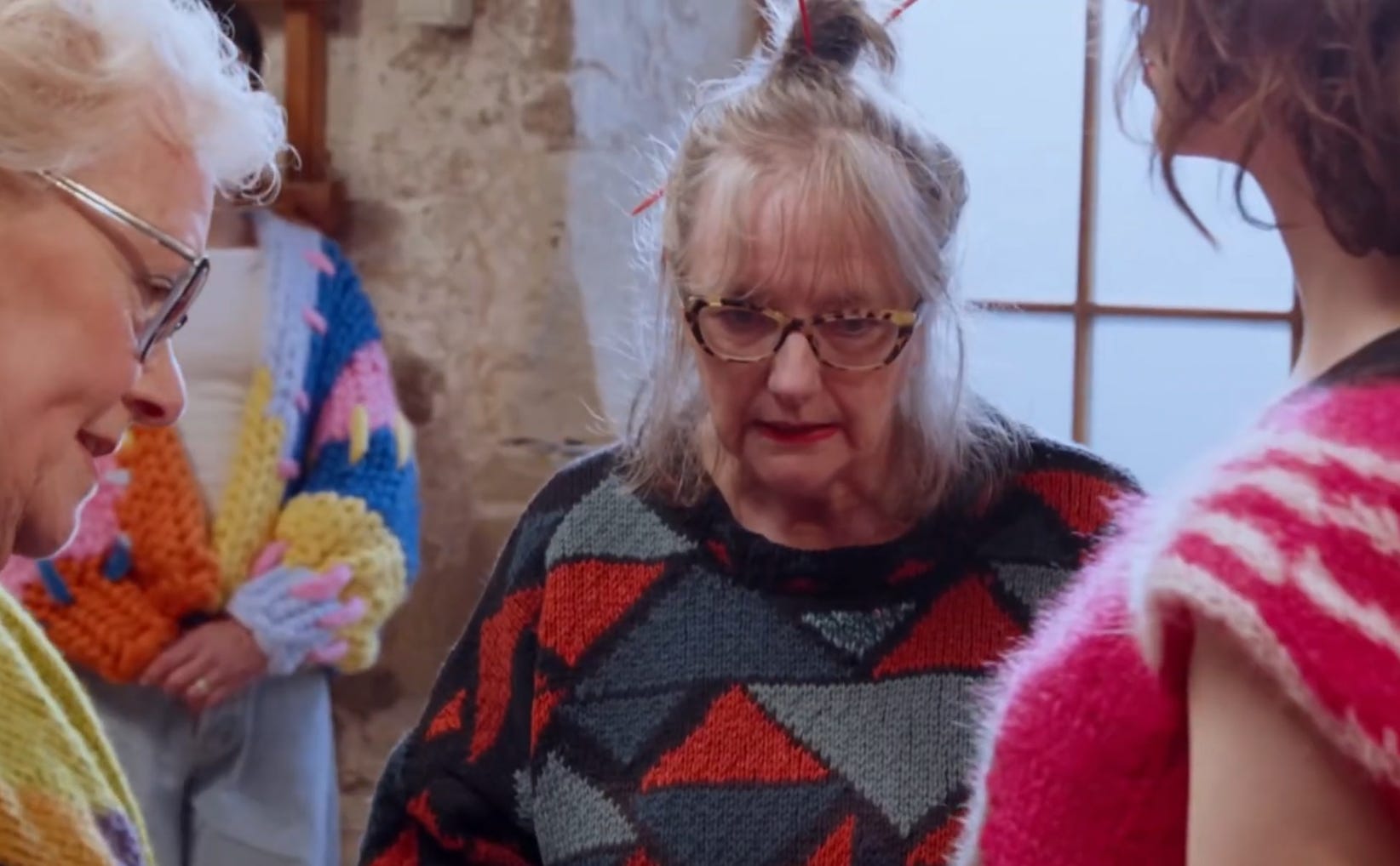 The group challenge required the creation of an 80s jumper using only mohair wool and incorporating the Intarsia color change technique with graphic, inventive designs. They had 10 hours. Crochet was not an element of any of the three designs.