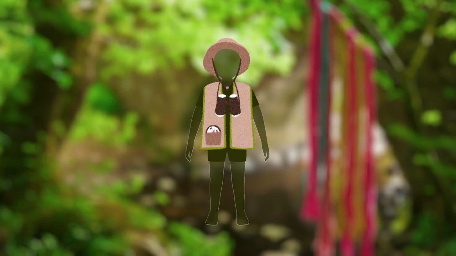 Isaac builds an explorer costume with a pocketed safari jacket, an intarsia globe, and a canvas-like fabric in spike stitch, accessorised with binoculars, compass, and a cleverly engineered pith helmet.