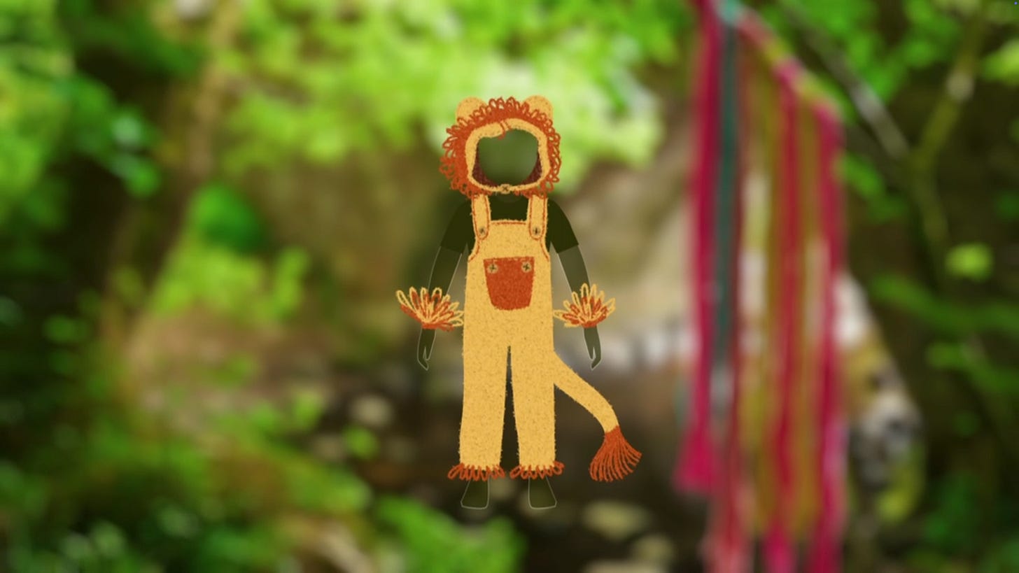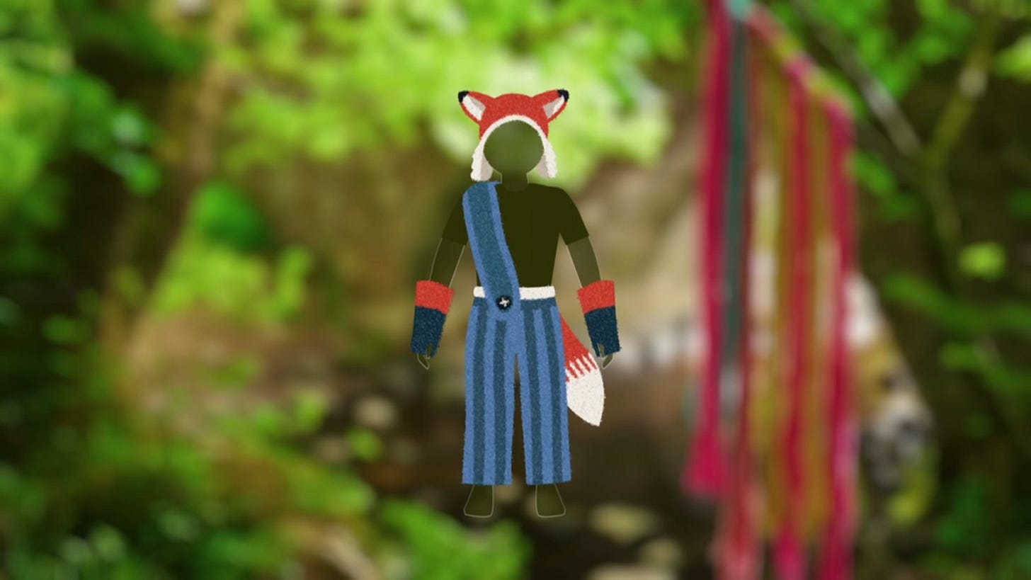 Holger revisits his childhood fox toy with striped dungarees, crocheted buttons, and a brushed-yarn headpiece for whiskery texture.