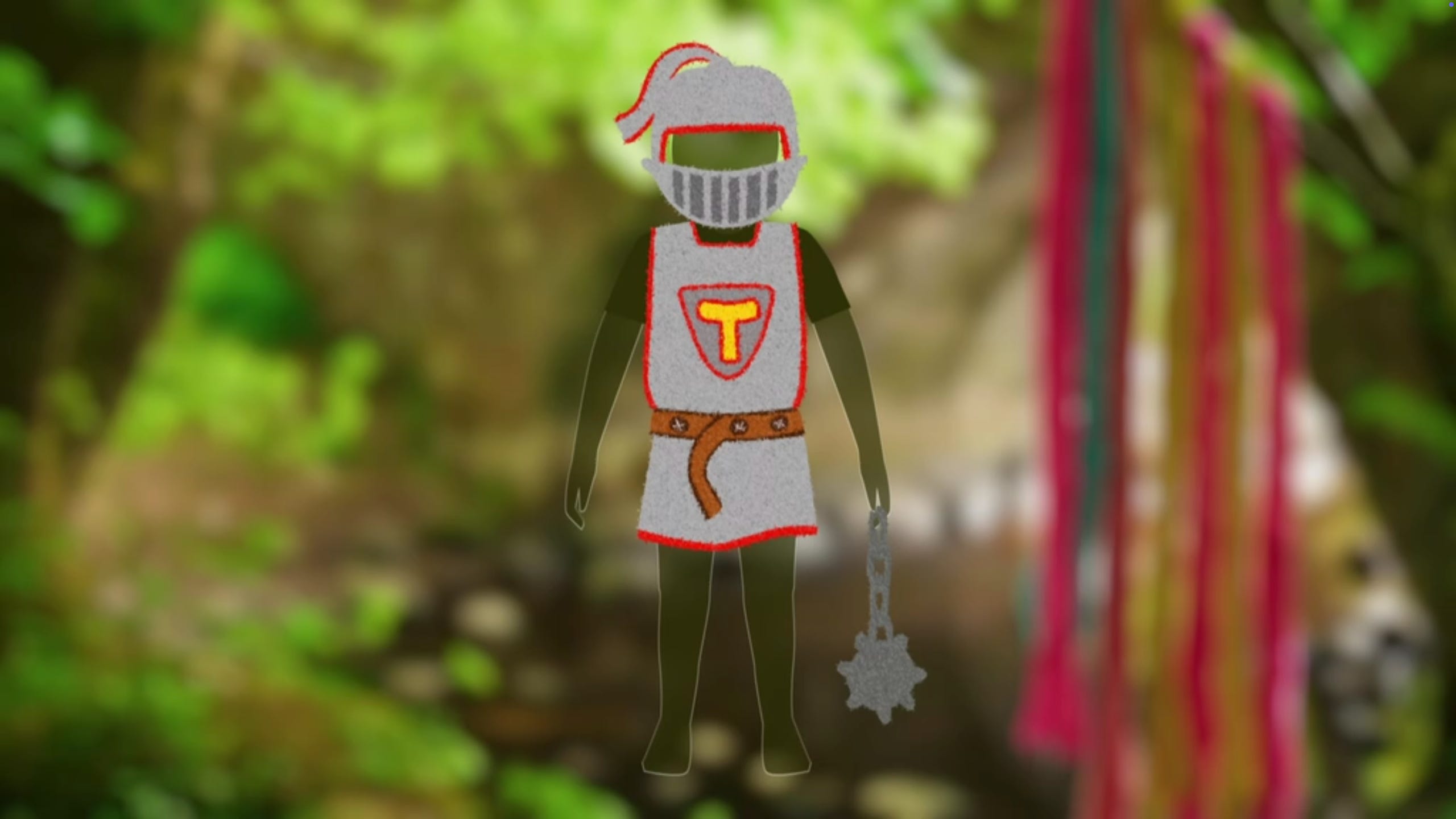Simon builds a knight costume with granny-square “chain mail,” a double-crochet helmet, and a mace/chain accessory shaped with double crochet, pushing the limits of his small crochet repertoire.