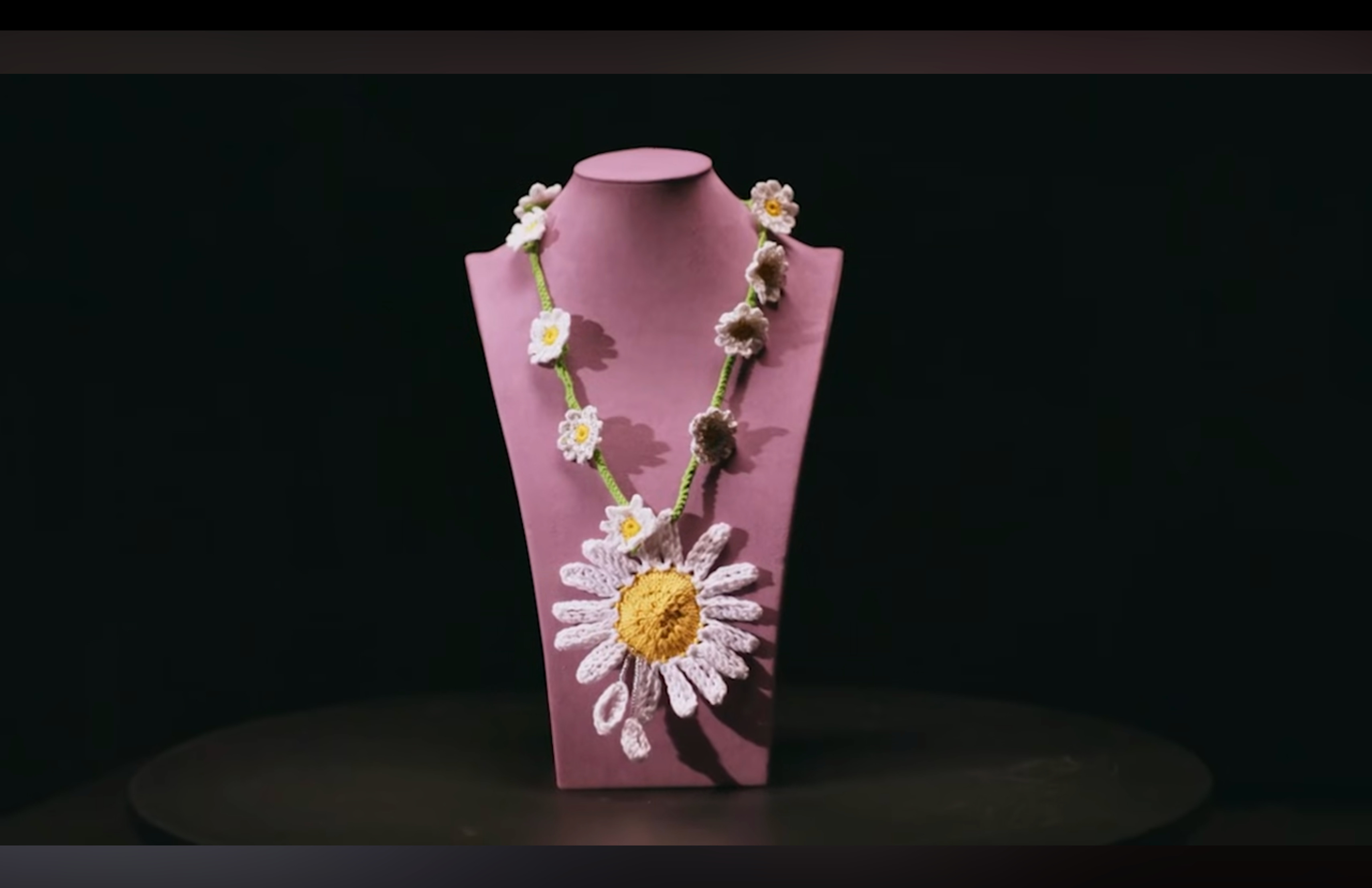 Freeform crochet daisy chain with pendant; worked without a plan; judges worried about lack of impact.