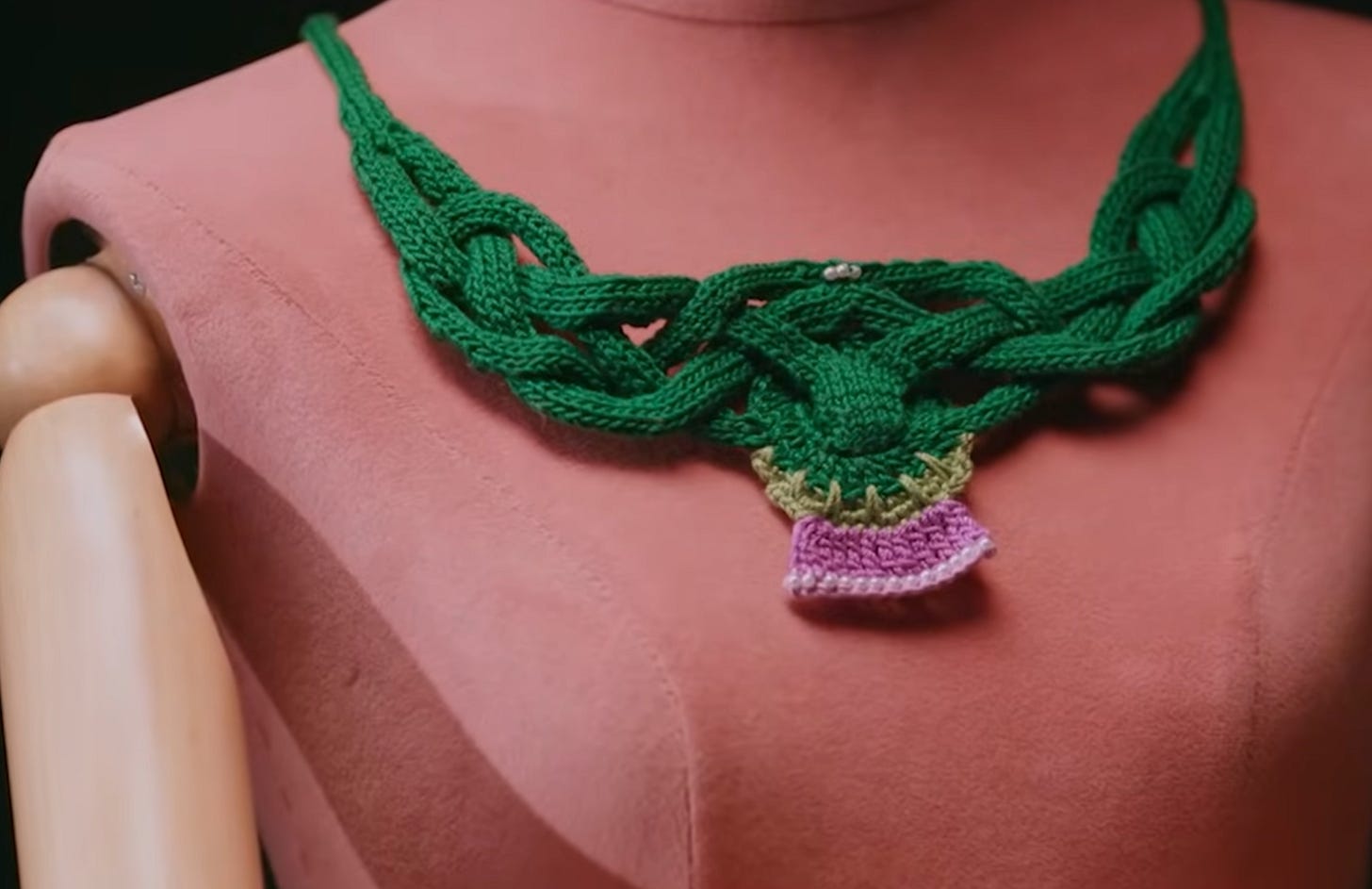 Scottish thistle inspiration; uses i-cords, knitted/crochet forms, and wire.