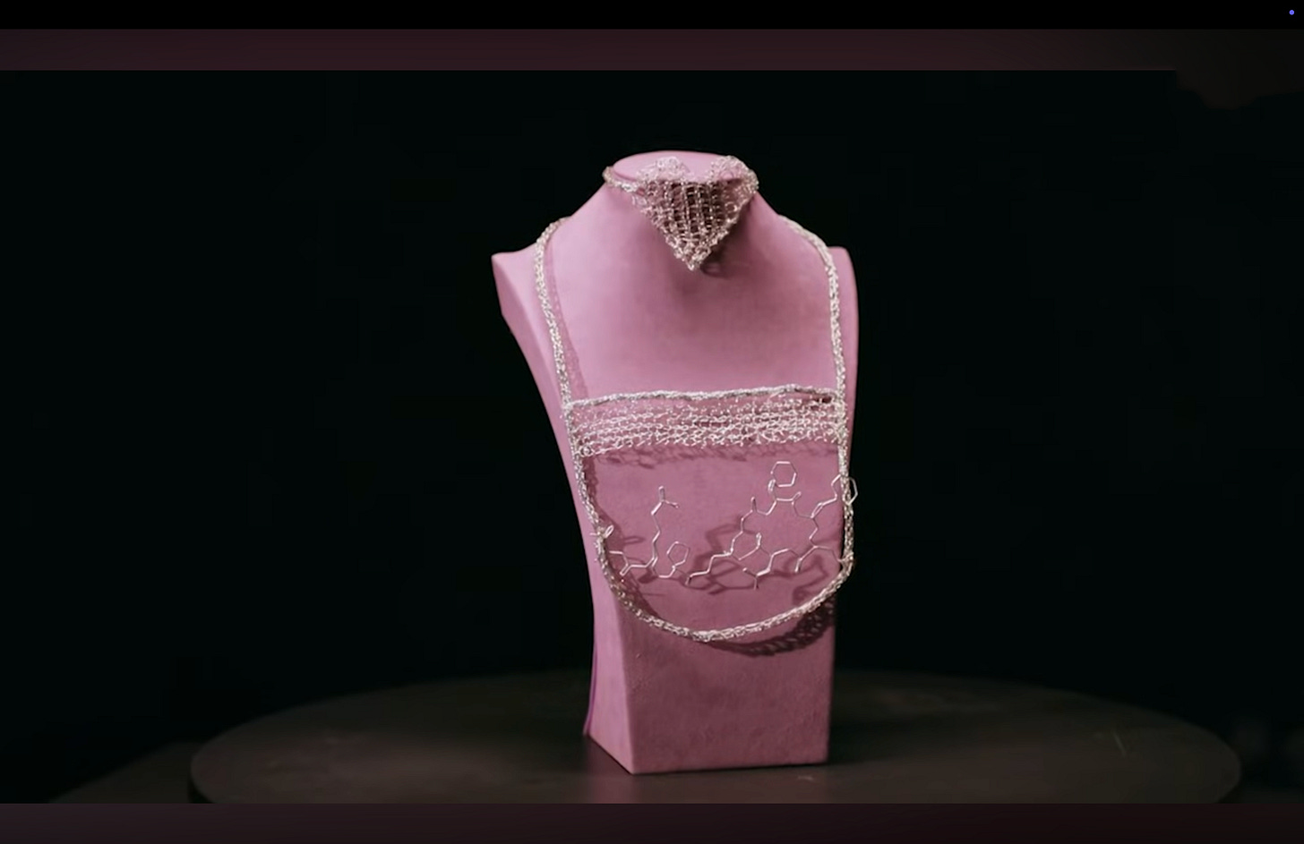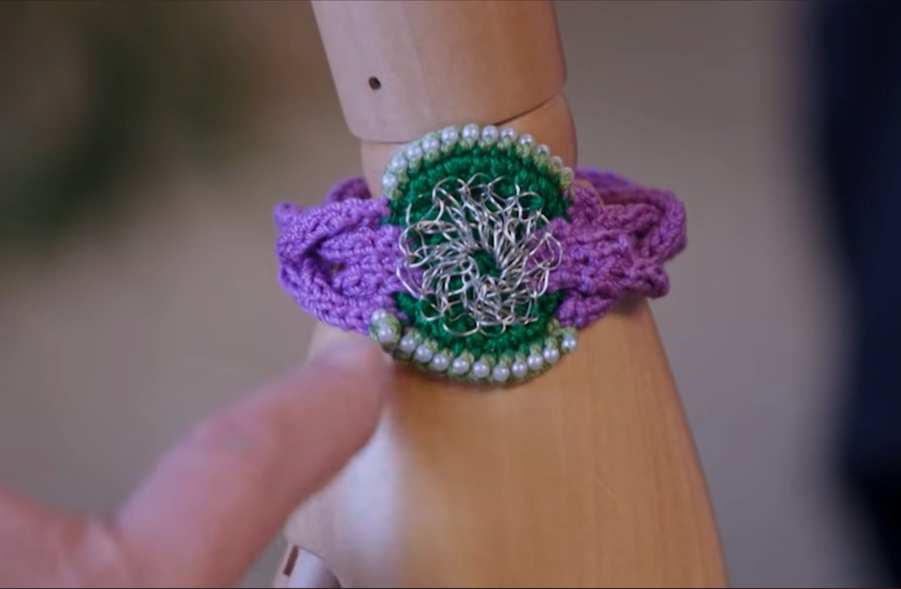 Dedicates jewelry to his wife; builds with metal wire to form a heart and oxytocin molecule; learns Viking knitting (wire chain technique using a crochet hook).