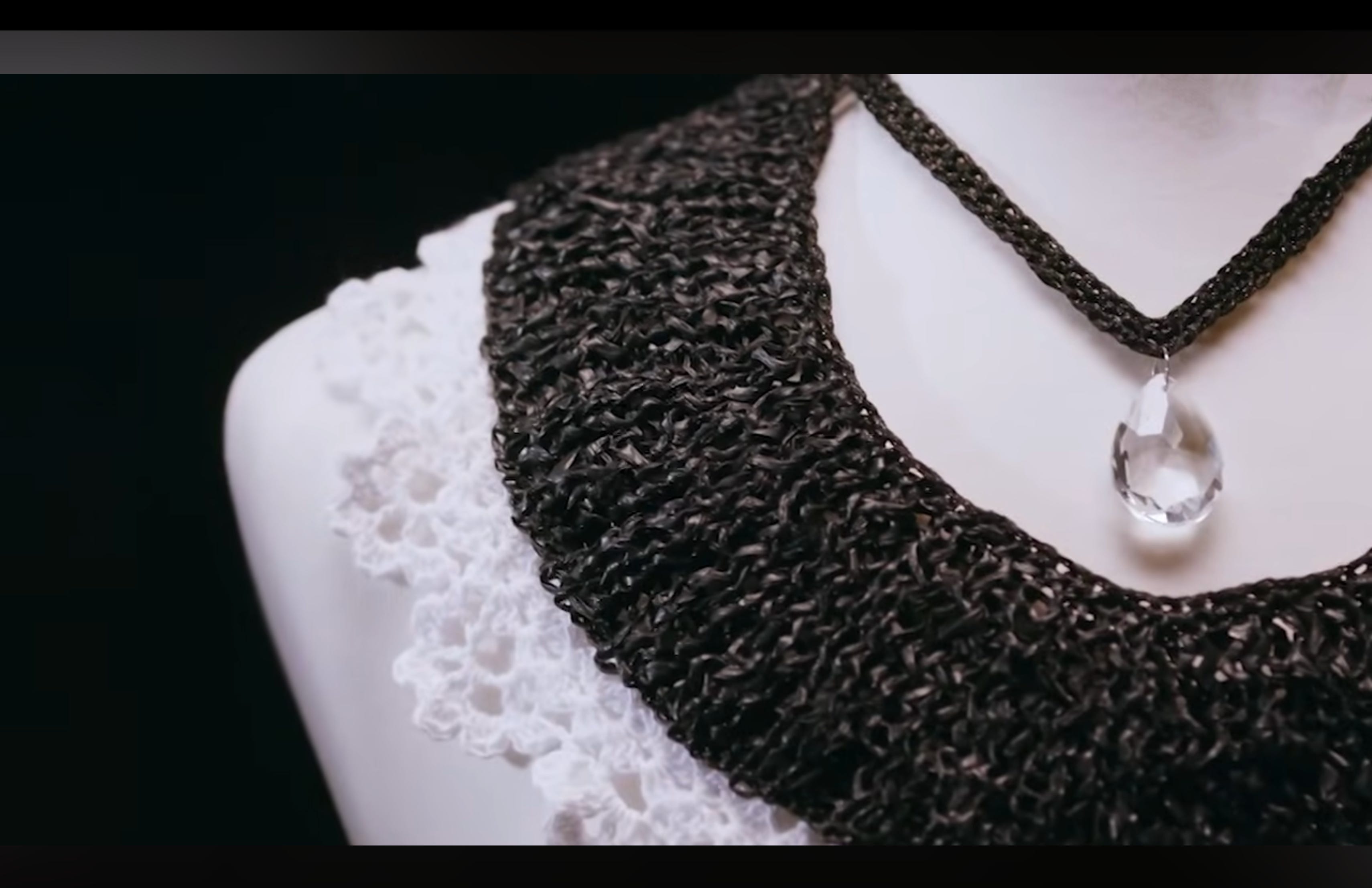 Makes plarn from bin liners (garbage bags) to mimic Victorian jet; knits collar + cuff; lace trimming.