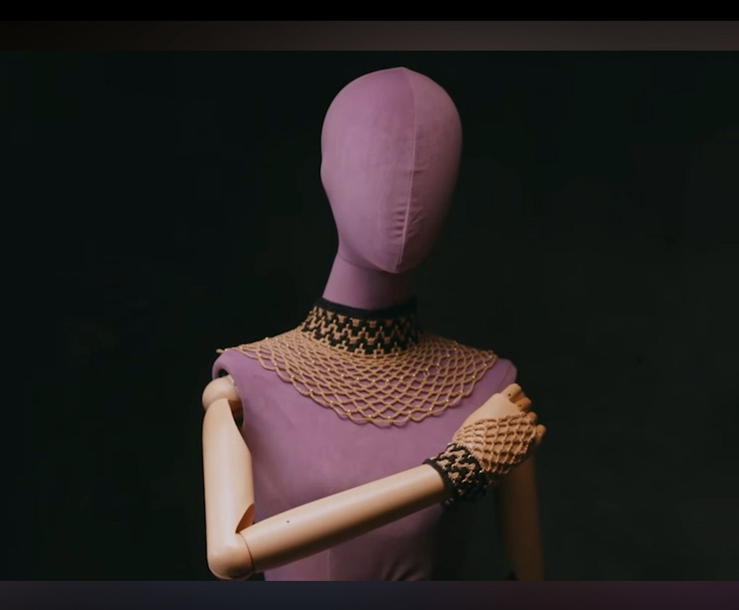 West African–inspired beaded choker and cuff; Mosaic crochet for structure; freeform lace crochet; bead-on-hook crochet technique.