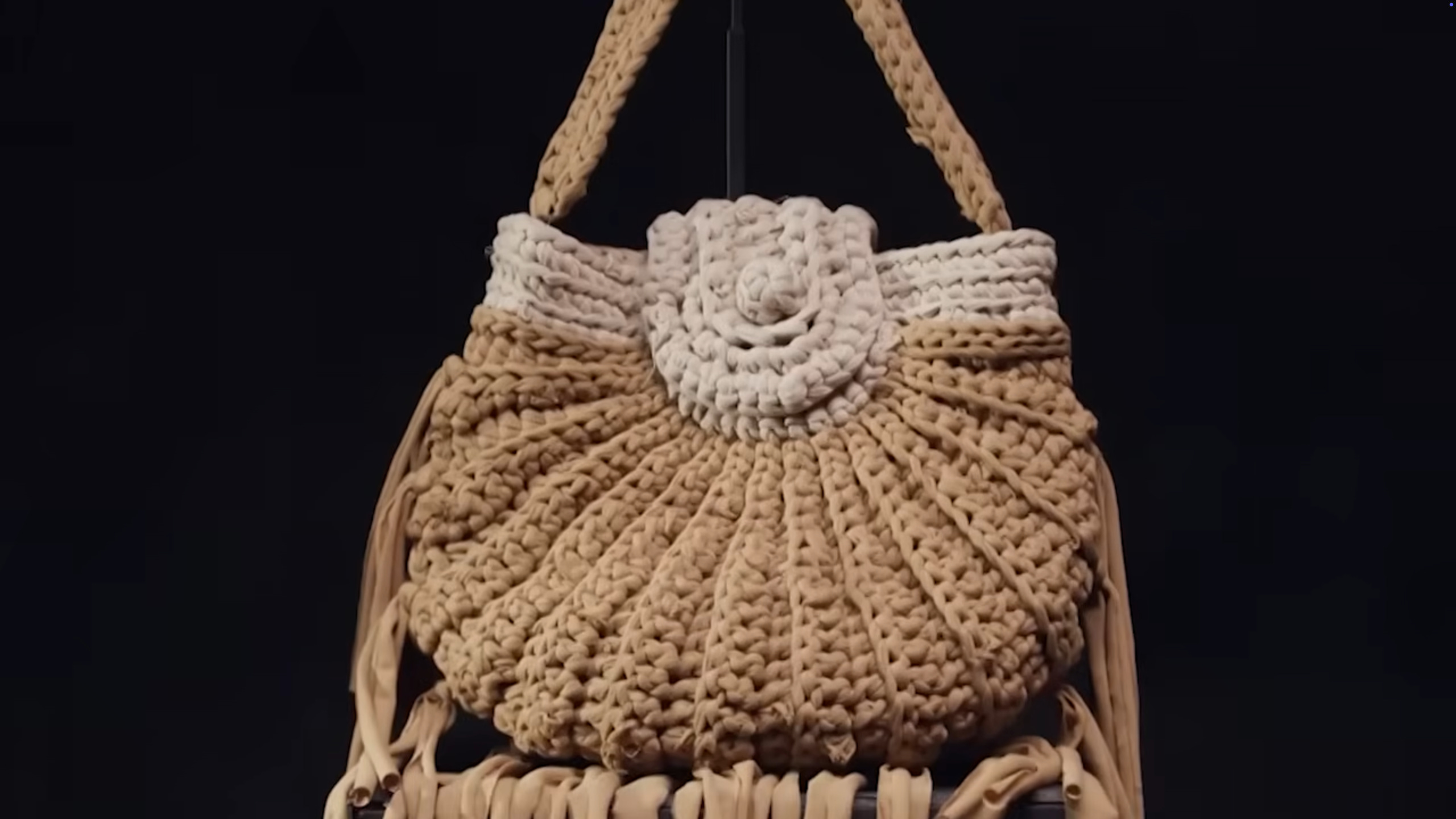 makes “T-shirt yarn” and crochets a festival-style saddle bag with a planned stitch strategy (building height/shape with different crochet stitches), plus a strap, a crochet button, and fringe (and he even lines it for stability-loves me a lined crochet bag!).