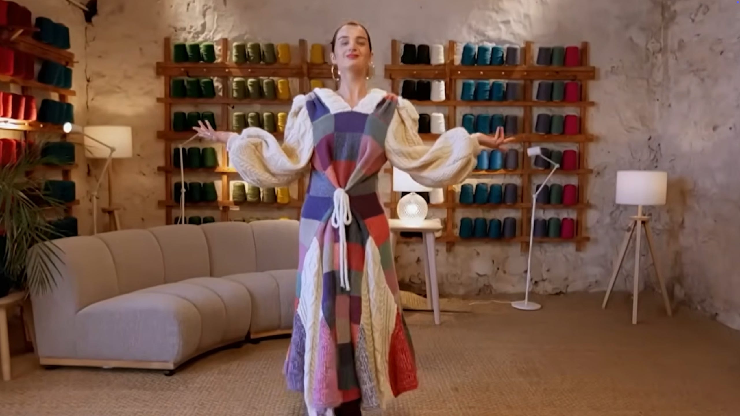 Holger and Lydia go bold and architectural: they swap sweater parts, body into giant balloon sleeves, a blanket for the body, and sleeves for the skirt, they insert godets (triangular panels) to add drama and movement—resulting in a striking shape that amplifies the Aran texture on the runway.