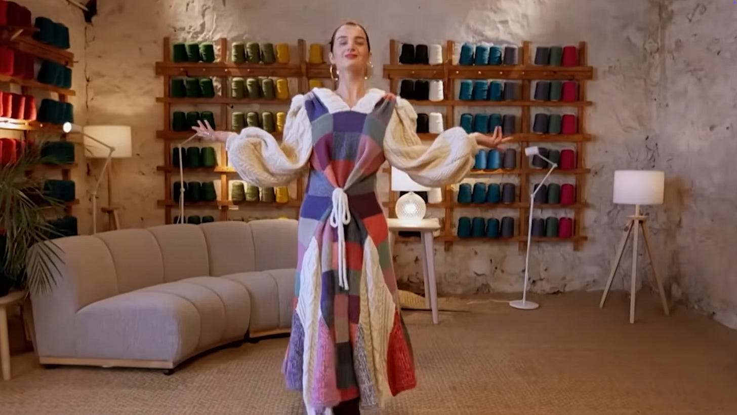 This week starts with a team challenge pairing the 4 contestants; they were to turn thrifted Aran (worsted weight) jumpers into catwalk-worthy couture. Each duo was given two charity-shop Aran sweaters plus haberdashery scraps, then asked to refashion everything into a perfectly fitted runway dress—with heavy emphasis on finishing, joining, and construction.