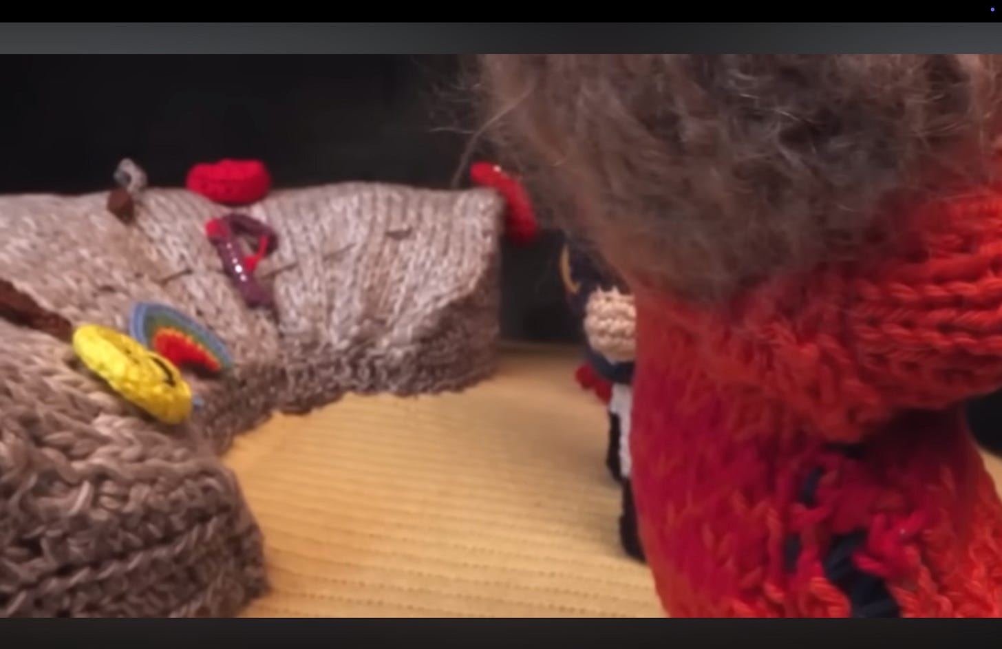 Holger makes the Tom figure and recreates Tom’s coat using loop stitch for texture; Ailsa builds Sheila with tiny intarsia triangles to mimic her jumper; Lydia knits Di with miniature Fair Isle and lace details, plus small knitting-needle accents. Around the characters they construct a tiny sofa, rolling “hills,” and they made small mementos representing eliminated contestants.