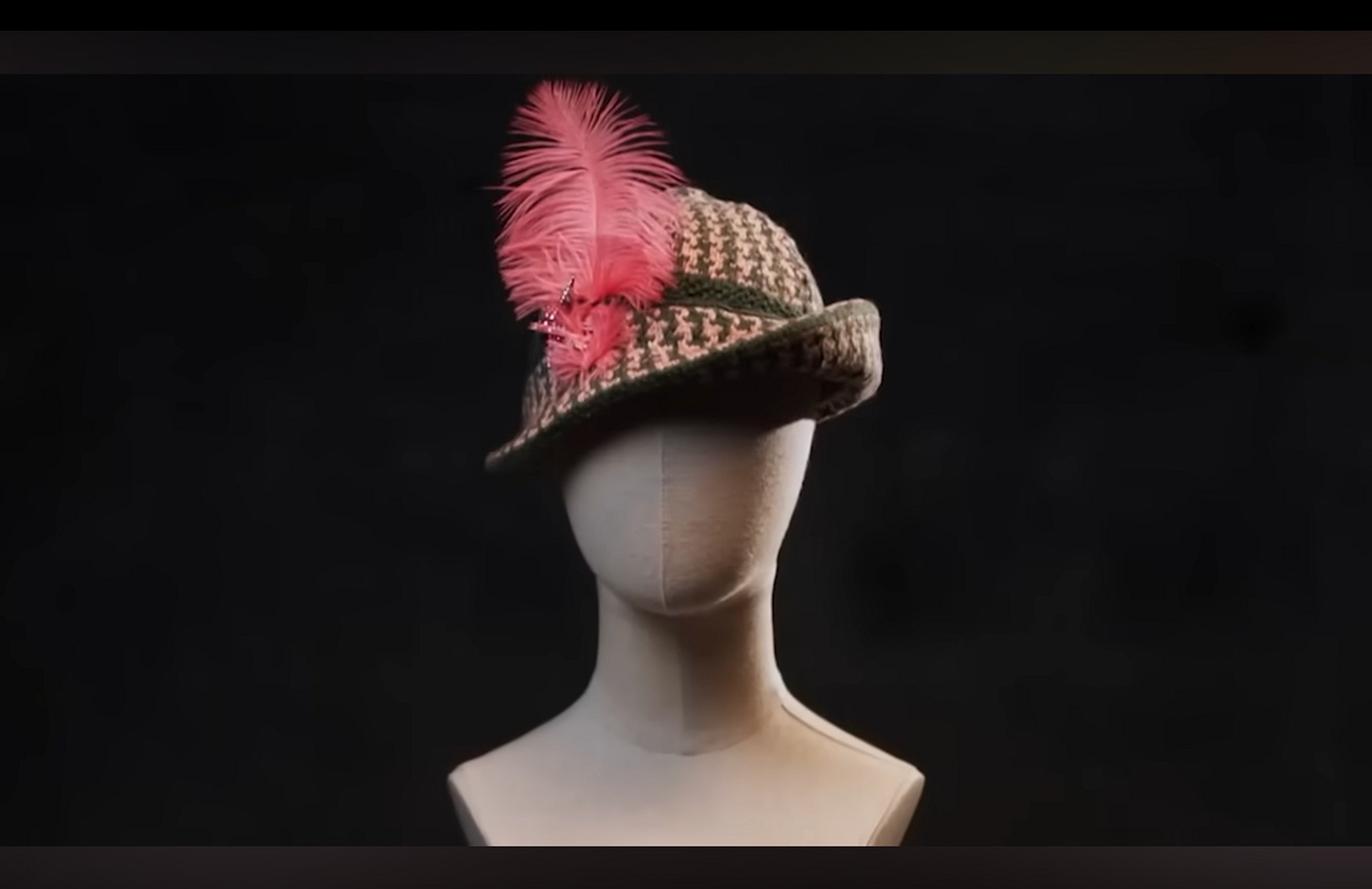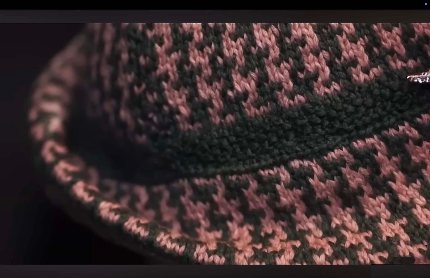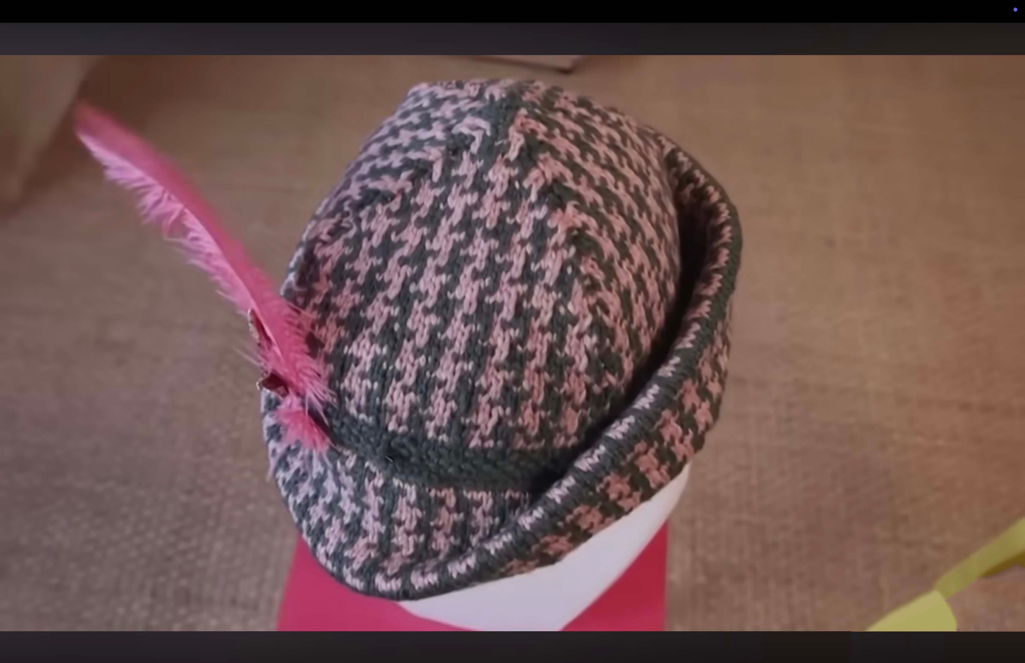Ailsa leans into vintage design with a Breton-style hat using classic houndstooth colorwork, constructed in panels and sewn to align the pattern; she adds a feather and a hidden Morse code patch spelling “G O W.”