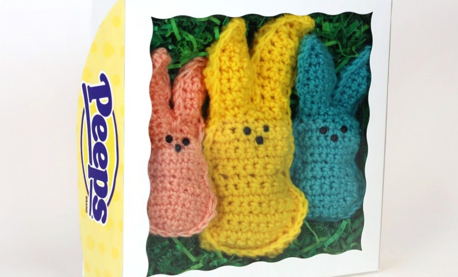 A PEEPS box stands upright with three crocheted PEEP bunnies inside. Center is a yellow. 1 of 4 — main gallery/A Box of Peeps by Azariah Niles from ...