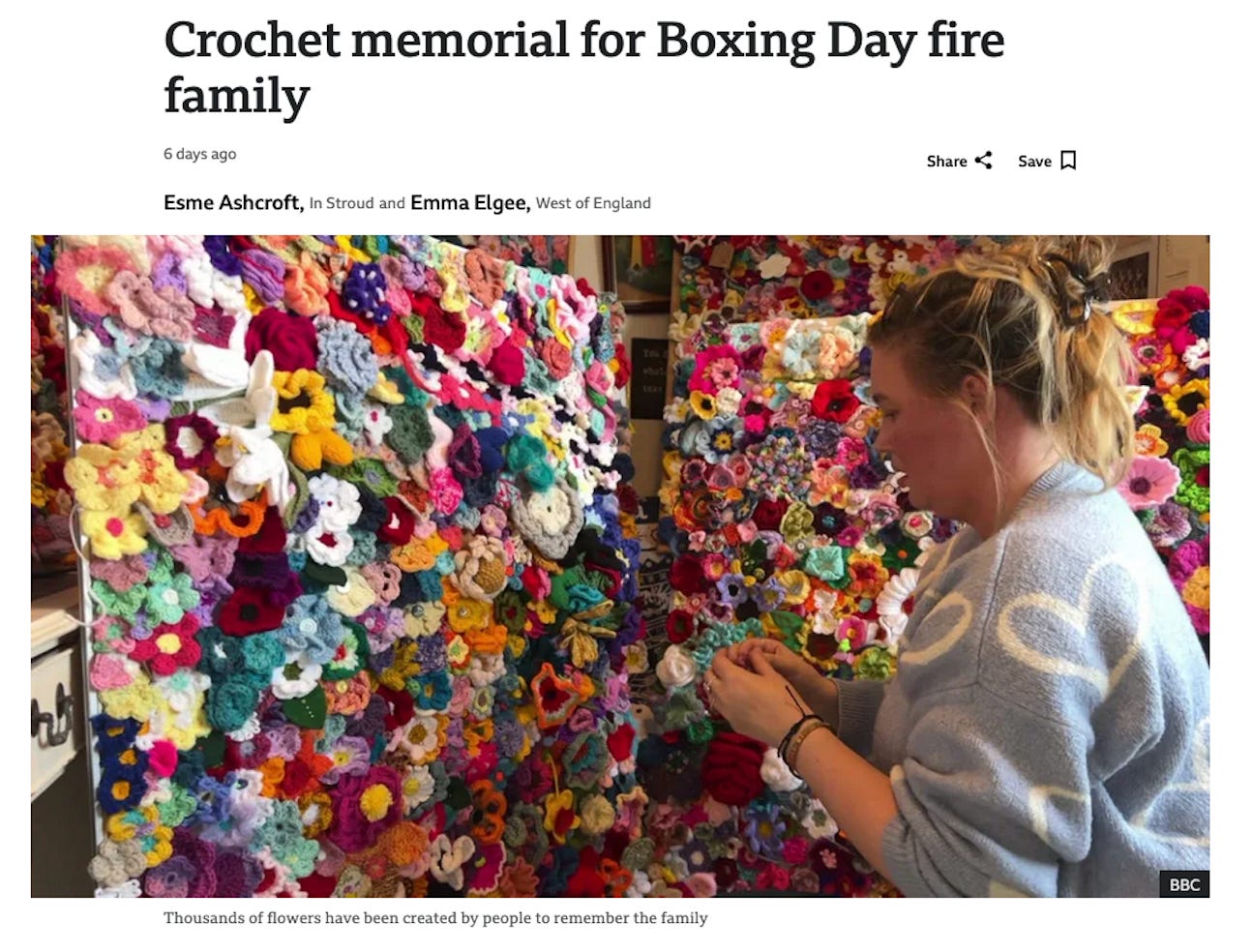 Crochet flower memorial for Stroud Boxing Day fire family - BBC