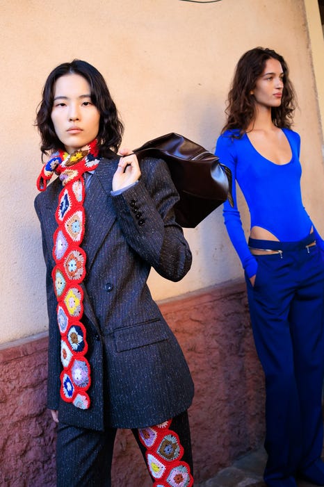 The rustic, sometimes explosively fringed knitwear also included crochet scarves and sweaters that recalled the part of McCartney’s childhood.