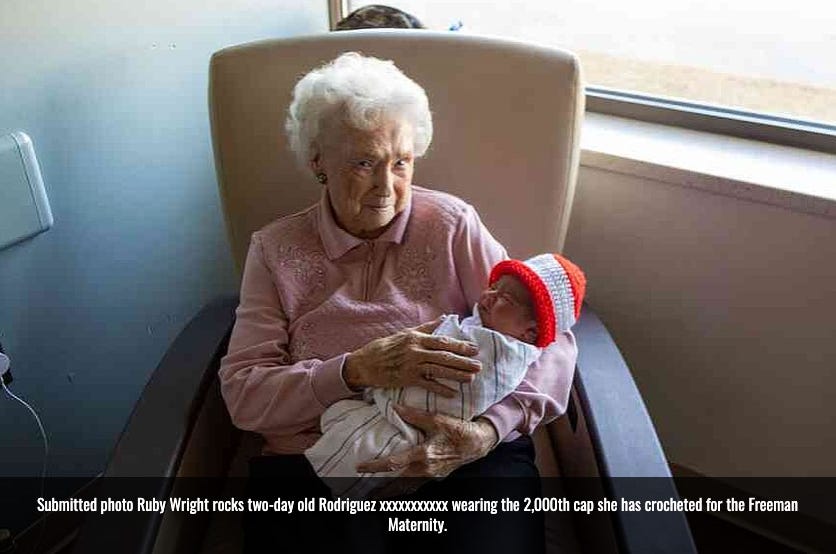 Like clockwork, longtime Freeman volunteer Ruby Wright made the now-familiar trek to Freeman's Maternity Center last week to drop off bits of crocheted love for Freeman's tiniest patients.