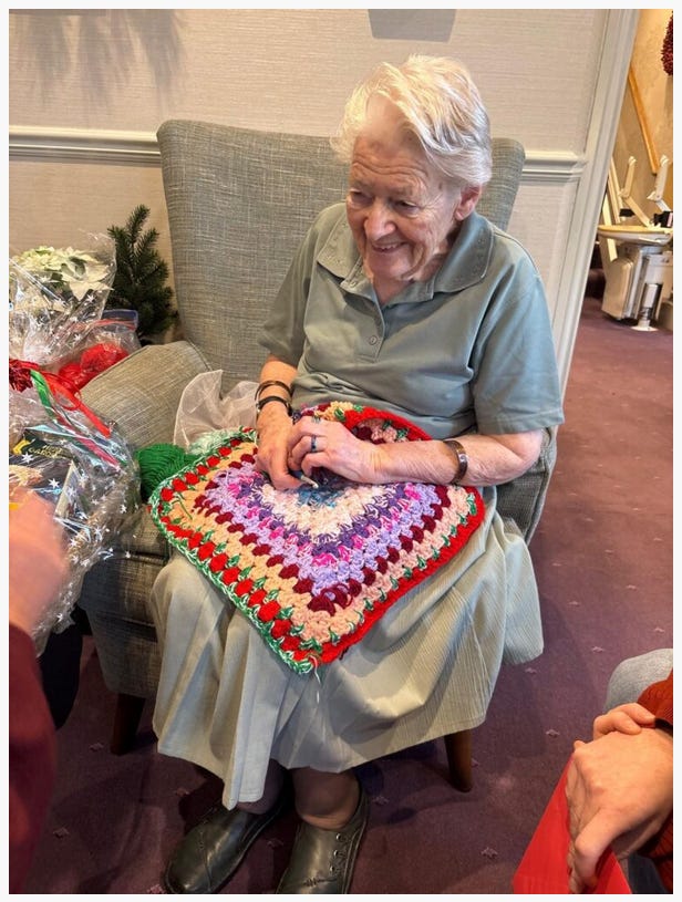 “Crocheting gives me something to do as I can’t see to read books and talking books tend to send me to sleep, but I’m very active, I enjoy walking and I like to crochet.”