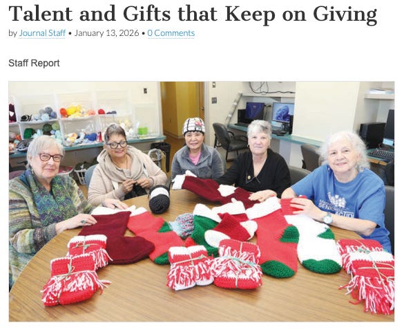 Staff Report. The Rossetti Cowan Senior Center Knitting/Crocheting Group. Shown with some of their most recent projects.