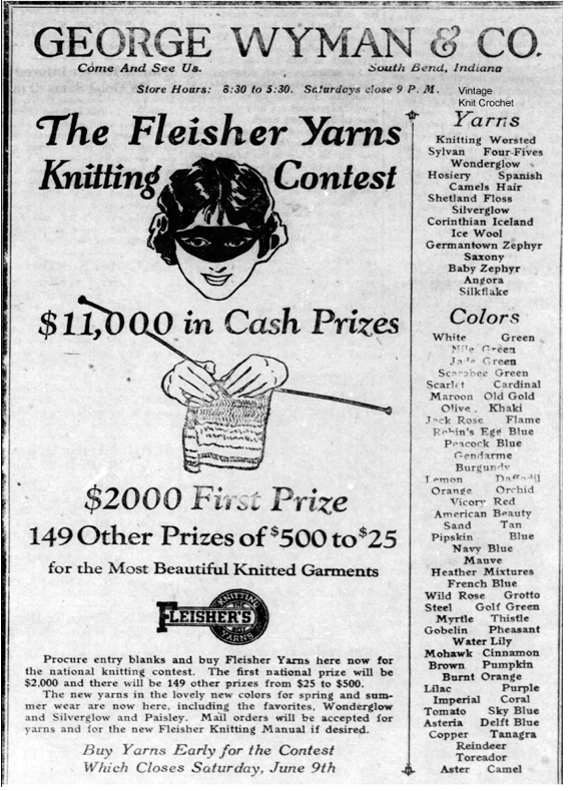 Fleisher Yarns National Contest (1923)—a blockbuster, nationwide competition with over $11,000 in cash prizes (top prize $2,000). Ads ran in popular magazines; local papers reported hometown winners. While widely labeled “knitting,” these campaigns rode the whole yarn-craft wave (crochet included) and dramatically raised the status of yarnwork as prize-worthy.
